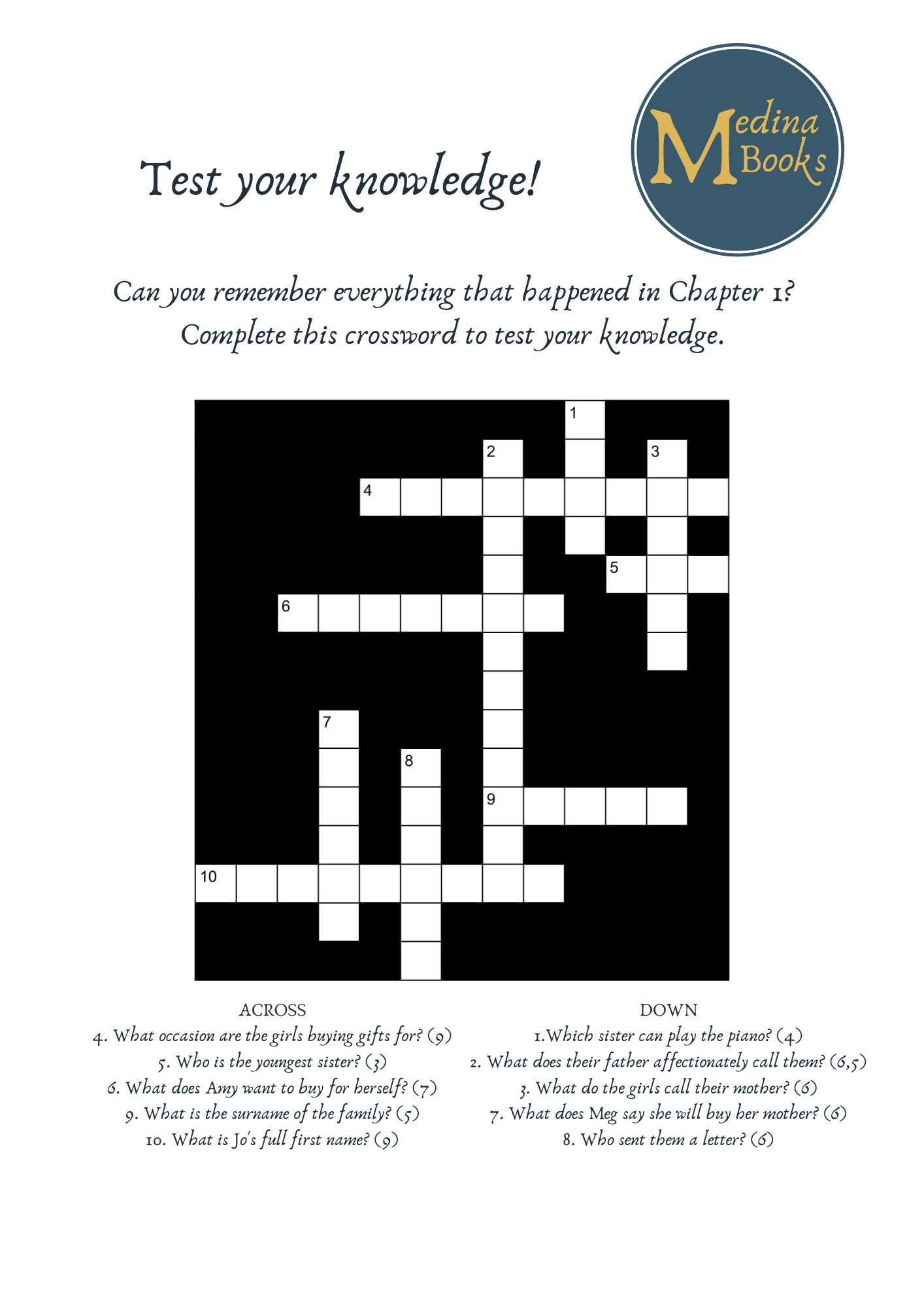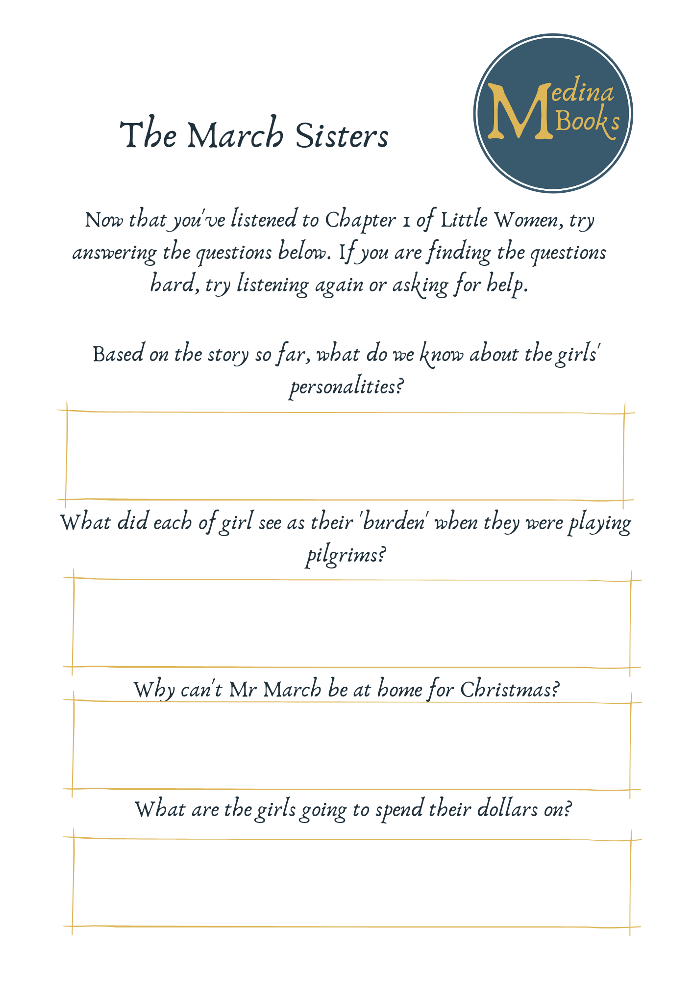 If you’re following along with our podcast, or you’re reading Little Women yourself, why not download a copy of our activity pack? There will be a pack for each chapter as our podcasts are released. A great way to see how well you or the kids have understood what you’ve just heard, whilst still having fun!