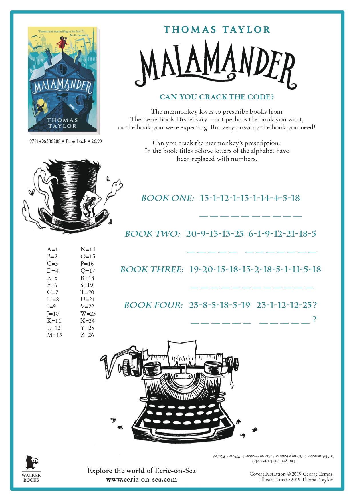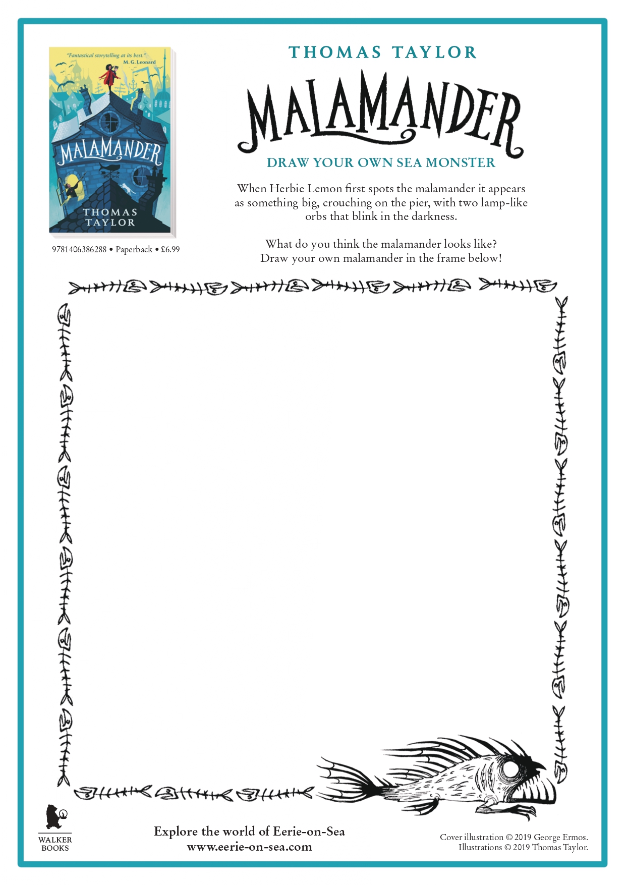 When Herbie Lemon first spots the malamander it appears as something big, crouching on the pier, with two lamp-like orbs that blink in the darkness. Using Thomas Taylor’s Malamander as inspiration, get creative, draw your very own malamander and crack codes.